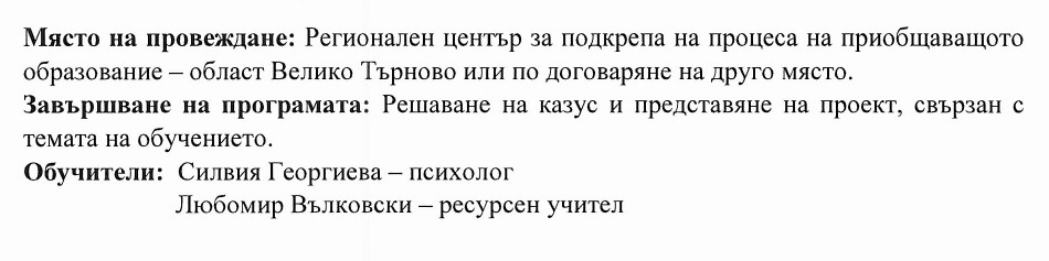 Във връзка с чл. 50, ал. 1, т. 3 и чл. 222, ал. 1 от Закона за предучилищното и училищното образование и чл. 11, ал. 1 от Правилника за устройството и дейността на регионалните центрове за подкрепа на процеса на приобщаващото образование Регионален център, област Велико Търново организира безплатни обучения в областта на квалификационната дейност на педагогическите специалисти по отношение на приобщаващото образование и допълнителната подкрепа за личностно развитие на децата и учениците. Продължителността на едно обучение е 16 академични часа (8 присъствени и 8 дистанционни), като всеки участник получава удостоверение за един квалификационен кредит. Заявки (по Образец №19) за обучения по посочените теми се подават от директора на учебното заведение на имейл адрес info-300139@edu.mon.bg